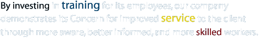By Investing in training for its employees, our company demonstrates its concern for improved services to the client through better informed, more aware and more skilled workers. Furthermore, our company is conveying to the employees that it has confidence in them and wants to make a commitment to their progress and future. As a result, more employees continue working, have more time and knowledge to manage effectively, and the job becomes a much smoother operation. With smoother and more efficient programs you, our customer, will be satisfied. |